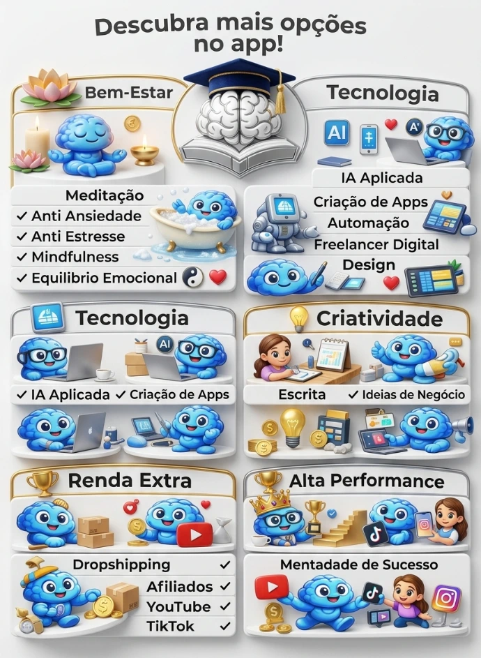 Marketing Digital, negócios, desenvolvimento pessoal, estudos, saúde e muito mais, sem precisar de vários aplicativos. Uma solução inteligente para todas as idades e todos os momentos.